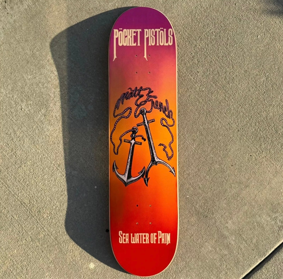 Screenprinted in California by Screaming Squeegees. This is not a reissue or a heat transfer. May have some storage scuffs. Heat transfers that can dry out and flake off over time. Artwork by the skater and artist Matt French. This board was never released. |
