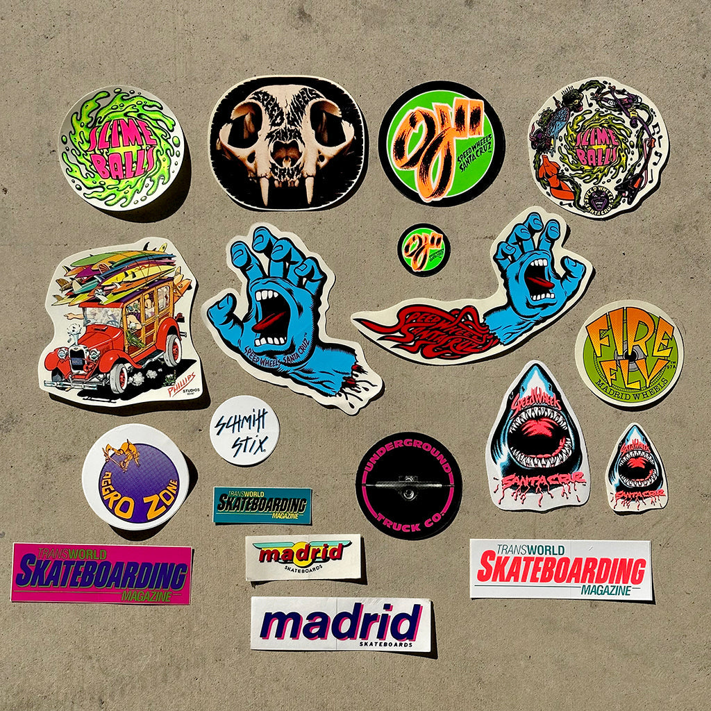 All Original New Old Stock Vintage Santa Cruz, Madrid, Schmitt Stix, OJ Wheels, Slim Balls, Transwold Skateboarding, Underground Trucks, Fly Wheels, and Jim Phillips. One pack of 19 Assorted stickers